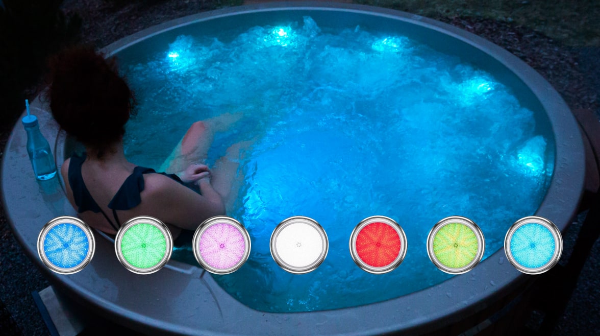 Take a look at how the big single LED looks — changing colors underwater in the evening, and also during the day when the tub is empty. Many thanks to our customer G. Key from the United Kingdom for sharing the video!