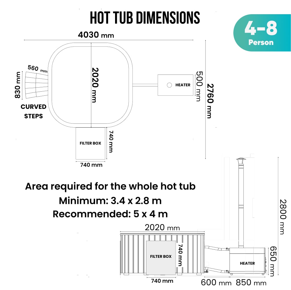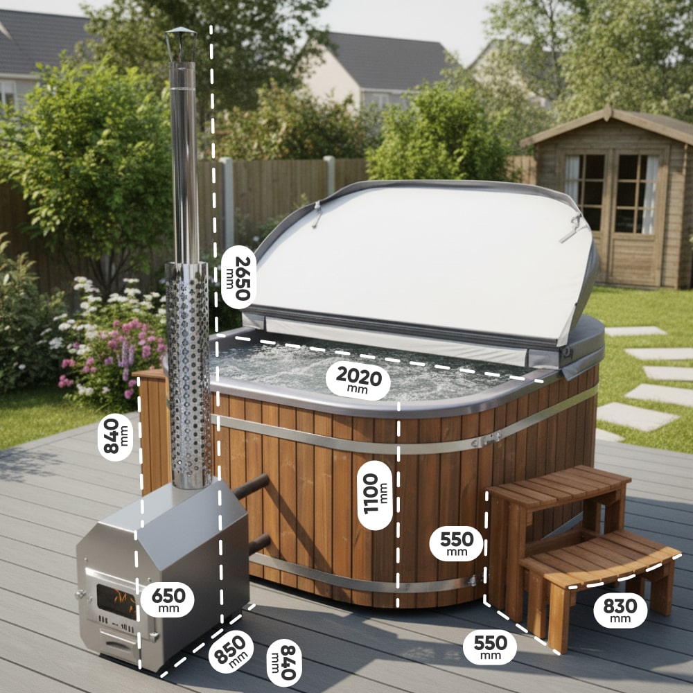 Square Wood Fired Hot Tub with Jets | External stove, sand filter & UV-C | 16 jets | 4–8 seater